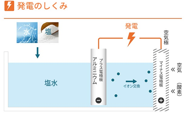 自然放電してしまう乾電池などと違い、水と塩を入れない限り発電しないので、数十年長期保存が可能です。 |