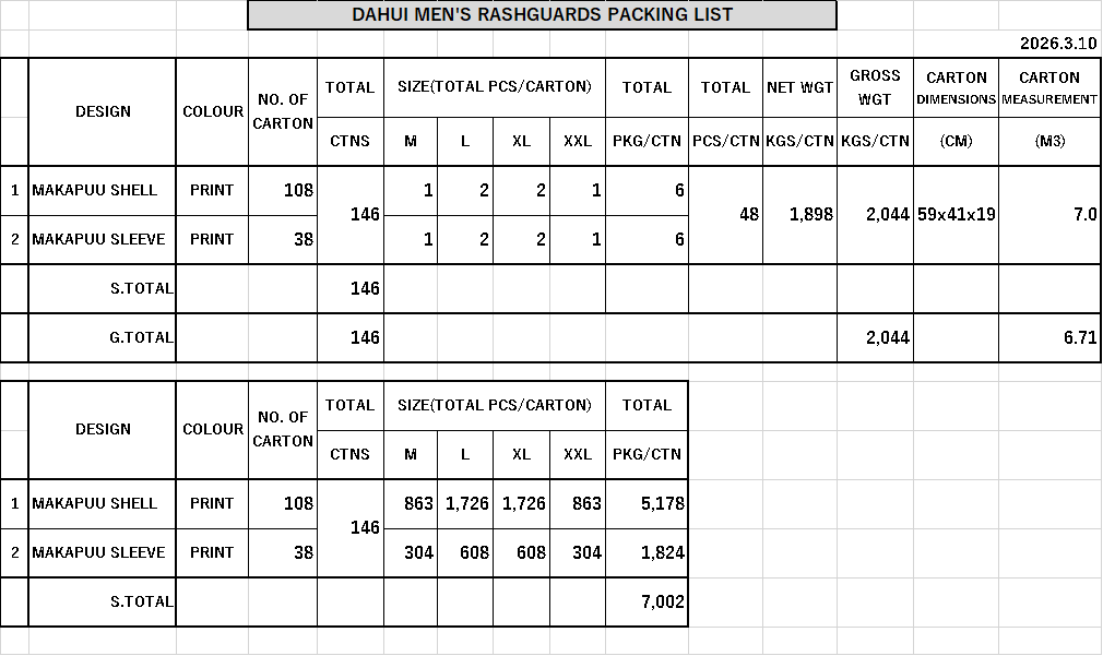 ■サイズ:M/L/XL/XXL(各数量は添付ファイルPacking List参照)